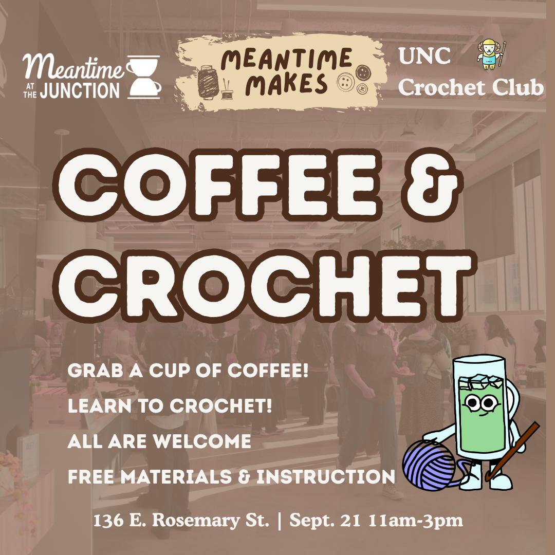 Meantime Coffee Co., UNC’s only student-run, nonprofit coffee shop, is excited to present “Meantime Makes,” a series of events at our Meantime at the Junction location bringing free, low-stress art workshops and events to the broader community. This week, we’re partnering with UNC Crochet Club for Coffee and Crochet. Participants are welcome to drop in for part or all of the workshop.